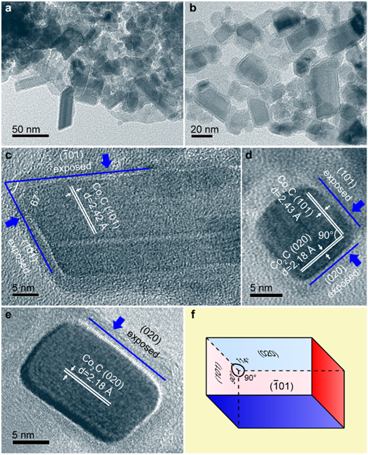 图1. FTO催化剂TEM照片。a, b, 低倍数TEM照片;c, d, e, 高倍数TEM照片;f, Co2C平行六面体纳米颗粒示意图。