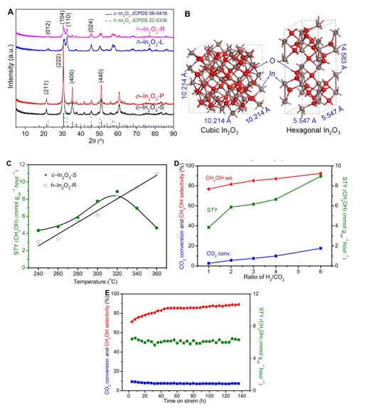 根据理论模型预测,一种热力学亚稳定的六方相氧化铟的{104}表面会在二氧化碳加氢反应中表现出更高的活性和甲醇选择性。因此,研究人员进一步采用极其简单的合成方法制备出具有不同晶相和形貌的氧化铟材料,对它们进行了详细的结构分析和波谱表征,并考察了它们在二氧化碳加氢反应中的催化性能,建立了氧化铟催化剂的构效关系。其中,一种主要暴露了上述{104}晶面的六方相氧化铟纳米材料在反应中表现出了最高的反应活性和甲醇选择性。另外,该材料即使在360摄氏度的热力学不利的高温反应条件下,仍保持极高的甲醇选择性(>70%),且该条件下甲醇的时空产率达到10.9 mmol/g/hour,远高于各种已报道的二氧化碳加氢制甲醇催化剂,包括传统氧化铟催化剂及铜基催化剂。(图2)