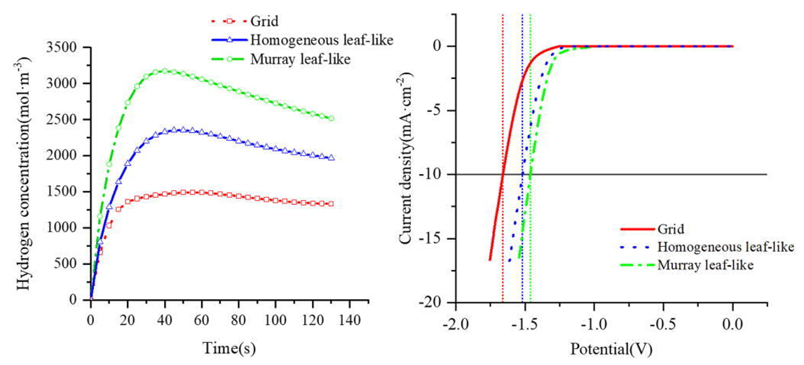 图2. (左)多物理场耦合模拟产氢浓度;(右)电化学实验LSV曲线。