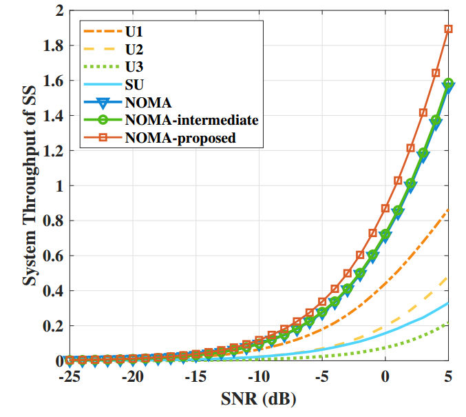 不同技术的吞吐量Vs信噪比性能走势对比(所提技术为橙色实线)