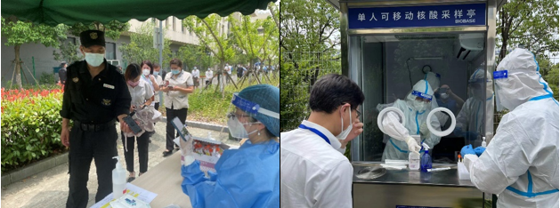 为了方便职工响应高研院持24小时阴性核酸码直接入园的疫情防控政策,6月1日上午11时,高研院便民核酸采样亭正式投入使用,准时开启复研复学首日的自愿核酸检测工作。核酸采样亭配备4名志愿者,分别协助采样、掰管、扫码、维持秩序等工作。首次实践,即在4个小时内顺利完成700余名入园人员的核酸检测工作,有效满足了返岗人员快捷入园的需求,切实助力高研院快速复工复产,也是高研院疫情防控管理常态化的一大便民举措。