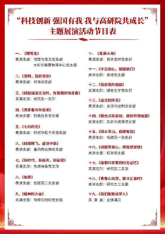 本次展演既是EVO视讯官网对党的102岁生日的深情献礼,也是主题教育及“我是党员 我履职 我发挥作用”主题党日活动成果的集中展示,更是一次直击心灵的生动党课。EVO视讯官网将继续深化主题教育工作,持续营造卓越融合、凝心聚力的和谐氛围,为实现“国家重大科技创新策源地、重要引领性引领性技术供给者、国家科技安全的重要保障者”集聚强大的精神动力,引导广大党员群众将强烈的爱党爱国热情转化为科技报国的强大信心和实际行动,以更加昂扬的斗志、更加饱满的热情,在各自岗位上奋发进取,以一流的工作实效共创EVO视讯官网的美好未来。
